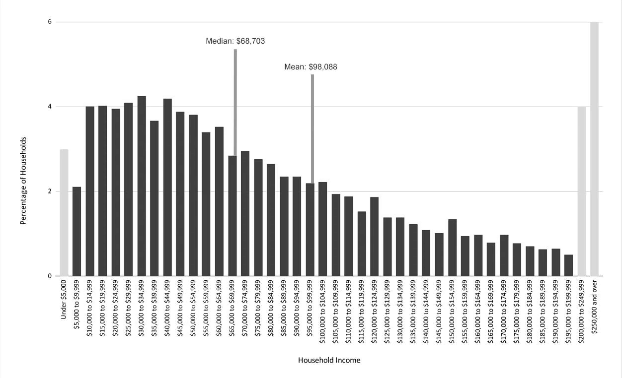 Figur 3. Distribution av hushållsinkomst i USA (2019). Märk: De grå staplarna på vardera sida av tabellen representerer inkomstvariabler större än $5,000. Källa: U.S. Census Bureau, Annual Social and Economic Supplement (2019)Ojämlikhet inom länder: Gini-indeks