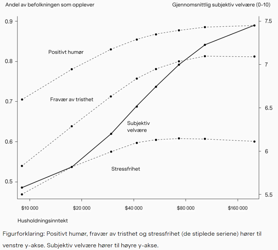 En fördubbling av inkomsten är förknippad med en ökning med cirka 1 poäng på en skala från 0 till 100 för upplevt välbefinnande, vilket verkar (enligt vår mening) förvånansvärt litet.