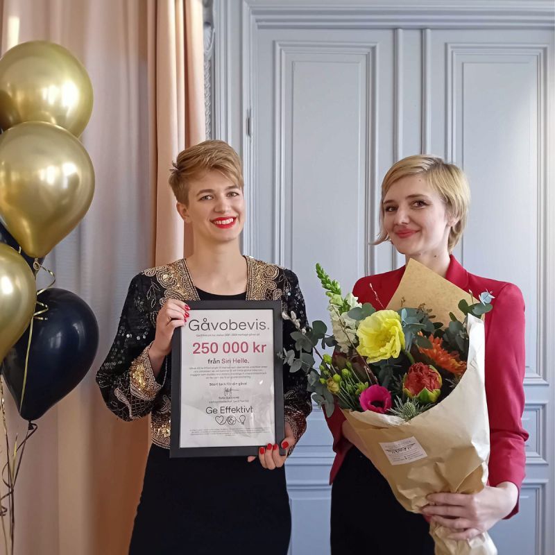 Siri Helle tar emot gåvobevis på 250 000 kronor i samband med releasen av sin andra bok "Existensboosten"Siri Helle, psykolog och författare samt ambassadör för Ge Effektivt, skänker samtliga royalties från boken “Känslofällan - Ta makten över dina tankar, känslor och ditt beteende" till välgörande ändamål. Hittills har detta bidragit till gåvor på 250 000 kronor, vilket motsvarar att: